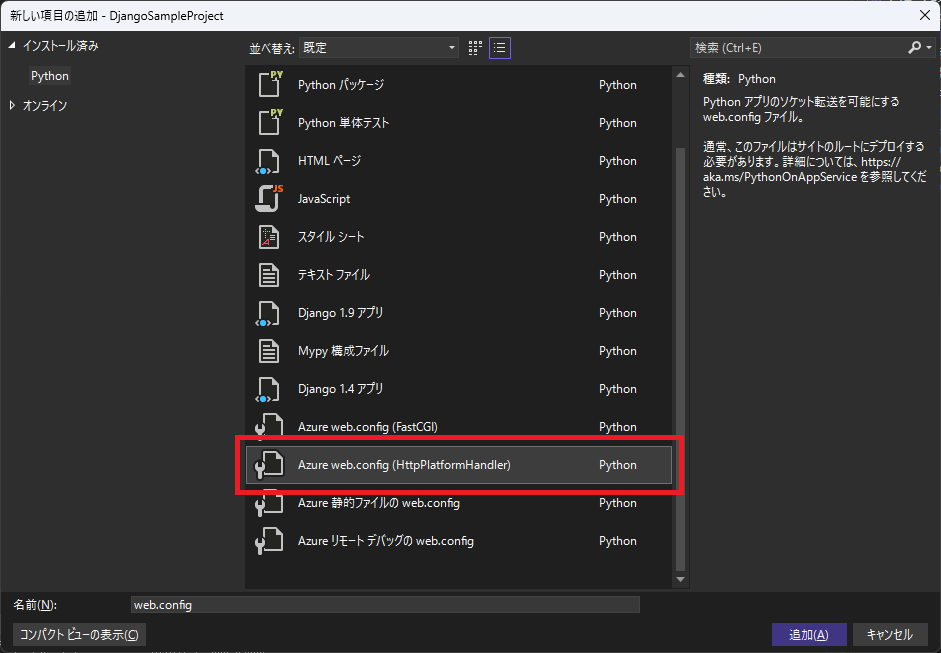 「Azure web.config(HttpPlatformHandler)」を選んで「追加」をクリックします。