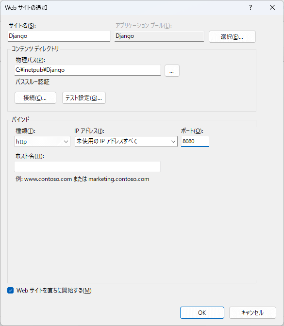 「インターネットインフォメーションサービス(IIS)マネージャー」を開き、左ペインの「サイト」を右クリックし、「Webサイトの追加」をクリックします。(SS取り忘れましたごめんなさい)
