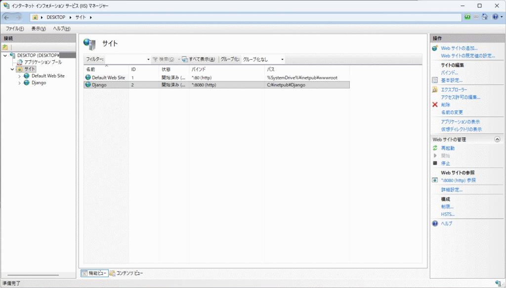 設定が完了するとIISマネージャー上でサイトが追加されたことが確認できます。