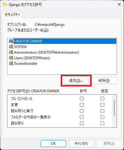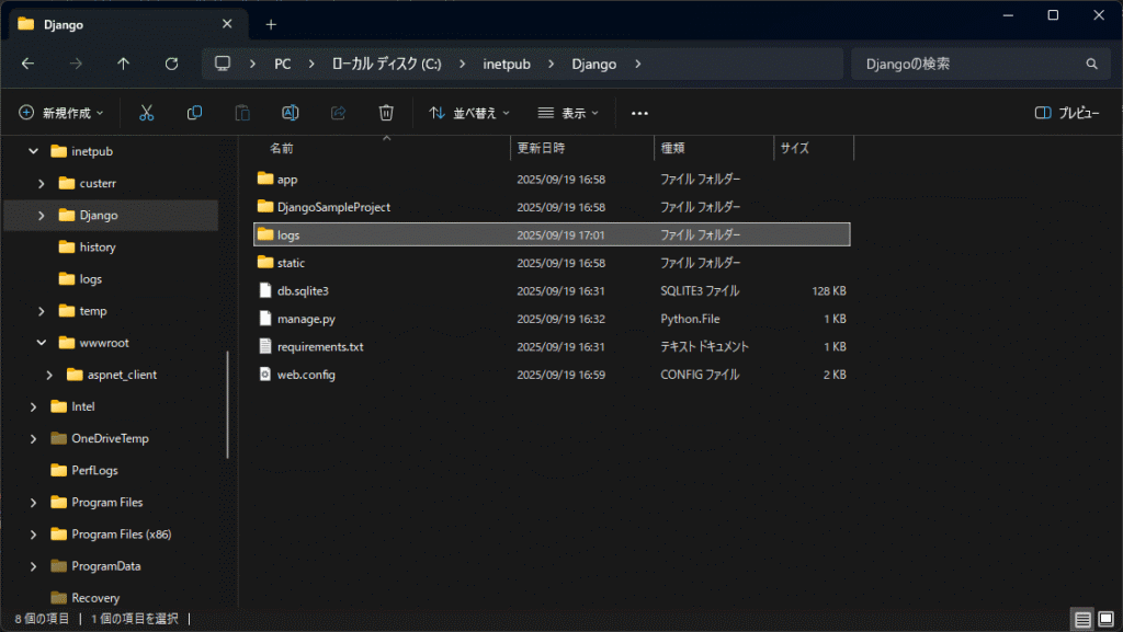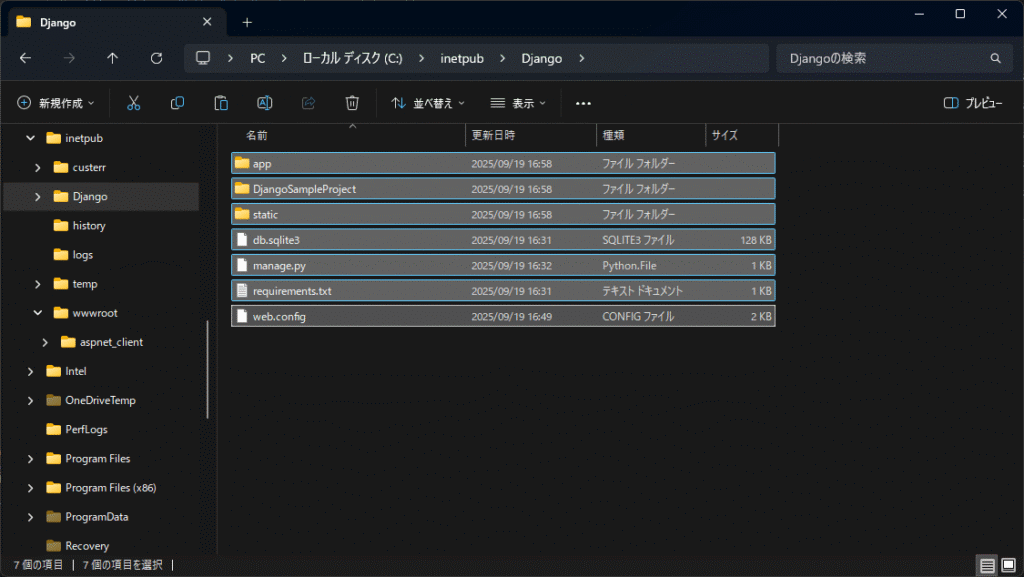 「C:\inetpub」配下に「Django」フォルダを作成。