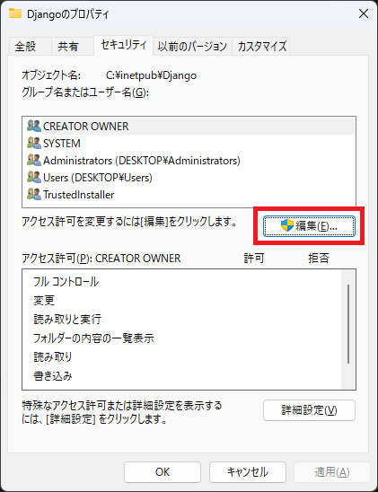 適切なアクセス許可を設定して完了。(Pythonは実行できればOK、IISは書き込みも)