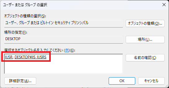 同様にIIS_IUSRSも追加し、「OK」をクリックします。