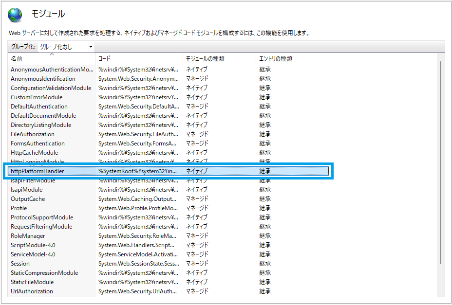 有効化が正しく行われたかどうかはIISマネージャーの「モジュール」から確認できます。